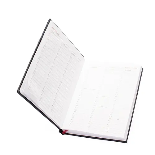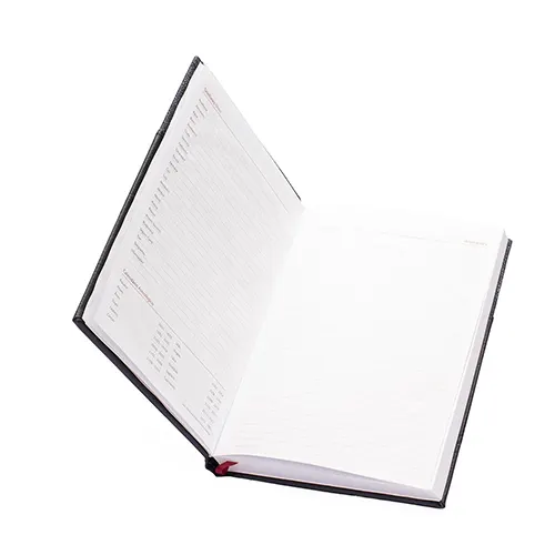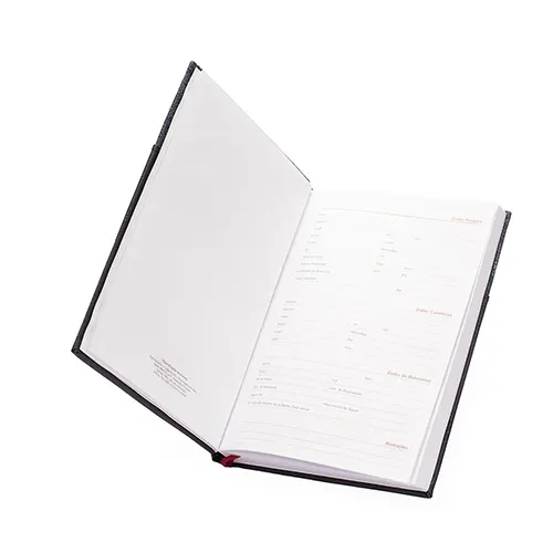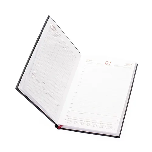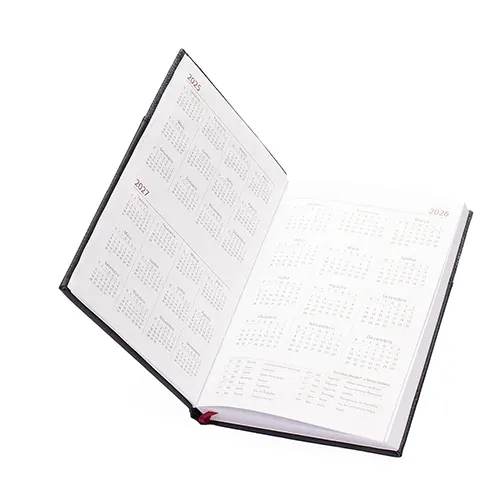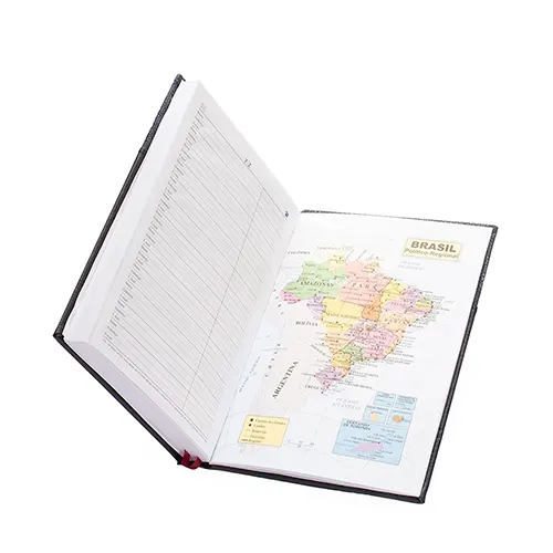 Agenda 2026 com capa dura em poliuretano (PU) e marcador de páginas em cetim. Possui páginas dedicadas a dados pessoais, calendários de 2026 a 2028, lista de contatos e itens de conversão de unidades de medidas, códigos DDD e DDI e mapas.