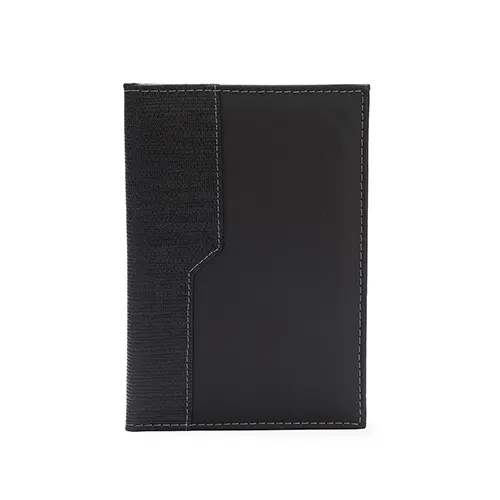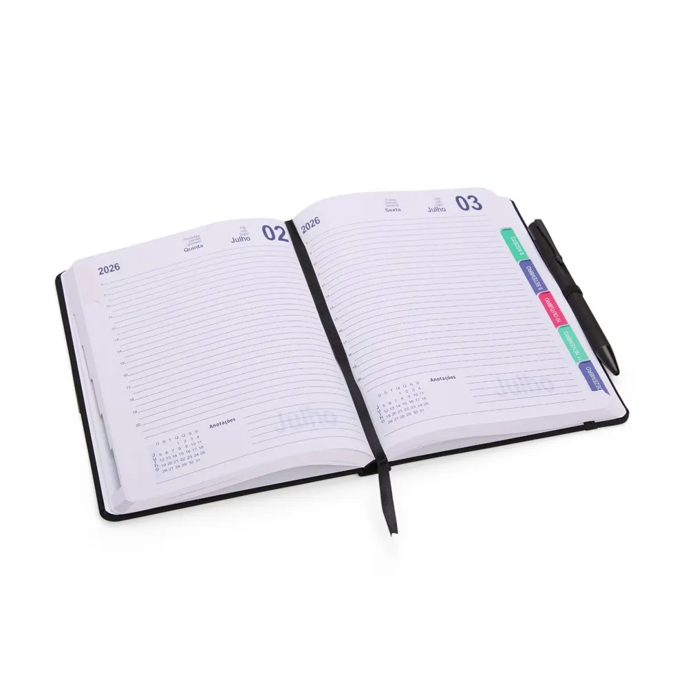 Descrição: Agenda diária 2026 com capa em couro sintético e marca-páginas em fita de cetim. Apresenta páginas dedicadas a dados pessoais, calendários de 2025 até 2027, listas de telefones úteis, planejamento diário e financeiro, lista de contatos e mapas.