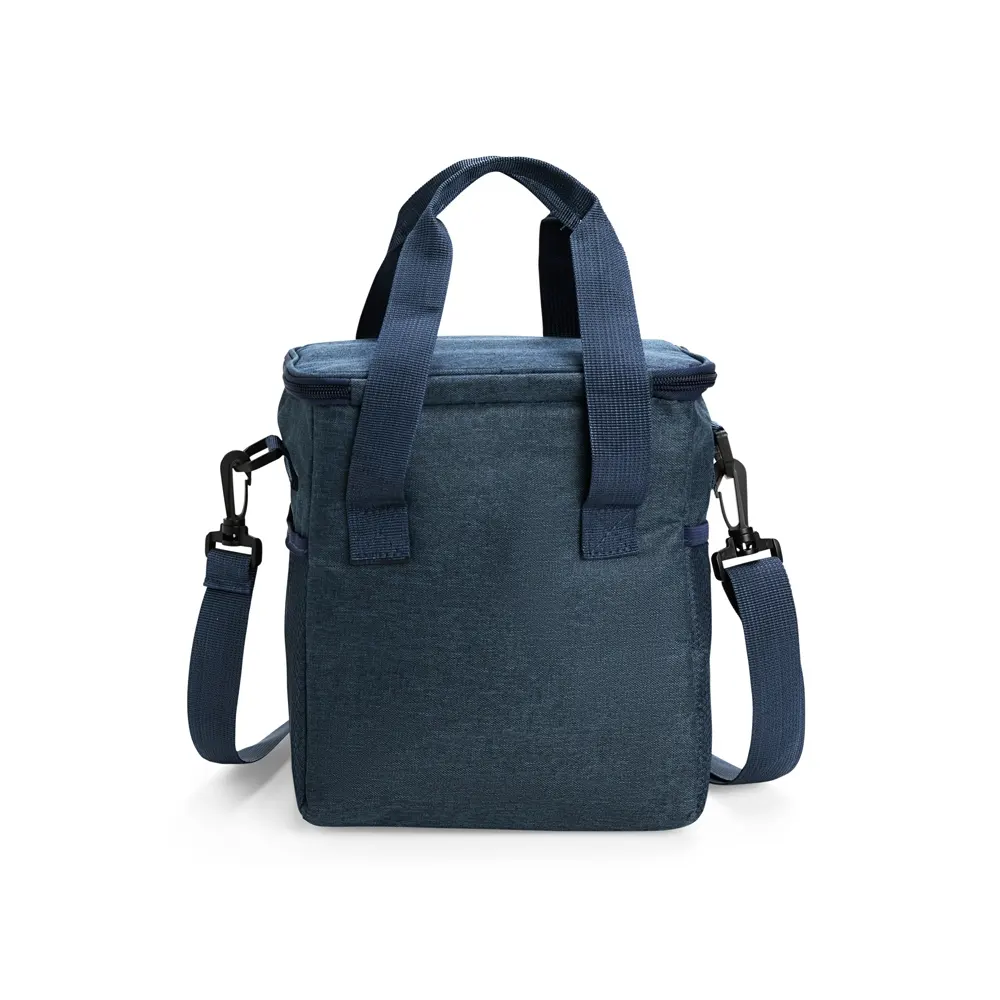 Descrição: Bolsa térmica em Oxford resistente à água, com capacidade de até 7 litros e fechamento em zíper. Possui revestimento térmico em folha de alumínio na tampa e em PEVA no restante do interior, contribuindo para conservar a temperatura de alimentos e bebidas por mais tempo. Apresenta bolso frontal externo com zíper e dois bolsos laterais em tela de nylon com elástico. Dispõe ainda de duas alças laterais fixas e uma alça transversal removível.