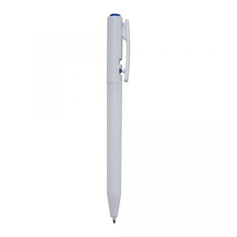 Descrição: Caneta plástica branca com detalhes coloridos. Anel central e acionador em relevo. Aciona por clique e para destravar basta apertar a parte inferior do clip.