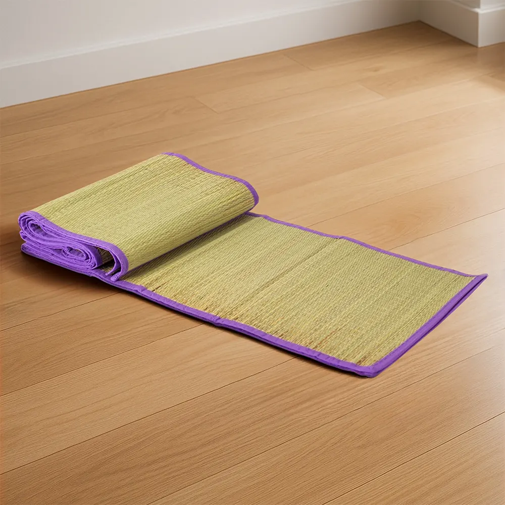 Descrição: Esteira dobrável em palha sintética com bordas costuradas em nylon dividindo a esteira em três partes. Além disso, possui um par de alças costuradas para transporte.