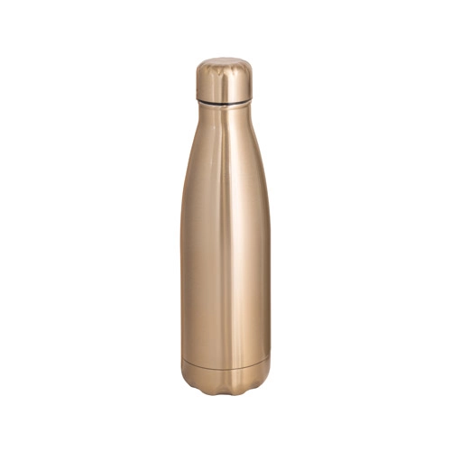 Garrafa em aço inox de parede dupla térmica, isolada a vácuo. Garrafa com acabamento metalizado e tampa em aço inox. Todas as componentes da garrafa – tampa, corpo e base – na mesma cor. Capacidade até 510 mL. Fornecido em caixa presente de papel kraft. Certificação EU Food Grade. ø70 x 255 mm