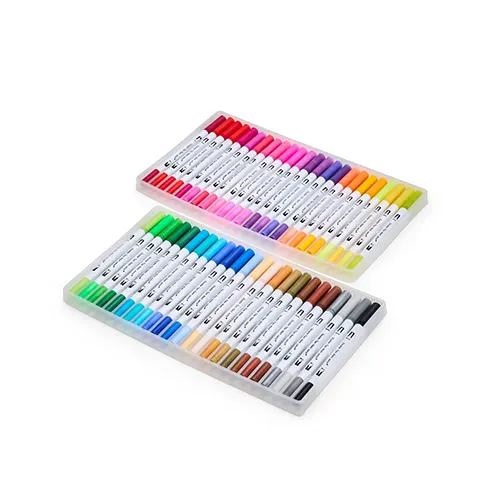 Descrição: Este é um kit com 48 canetinhas de cores únicas e distintas com pontas duplas: uma fina e a outra em formato de ponta pincel.