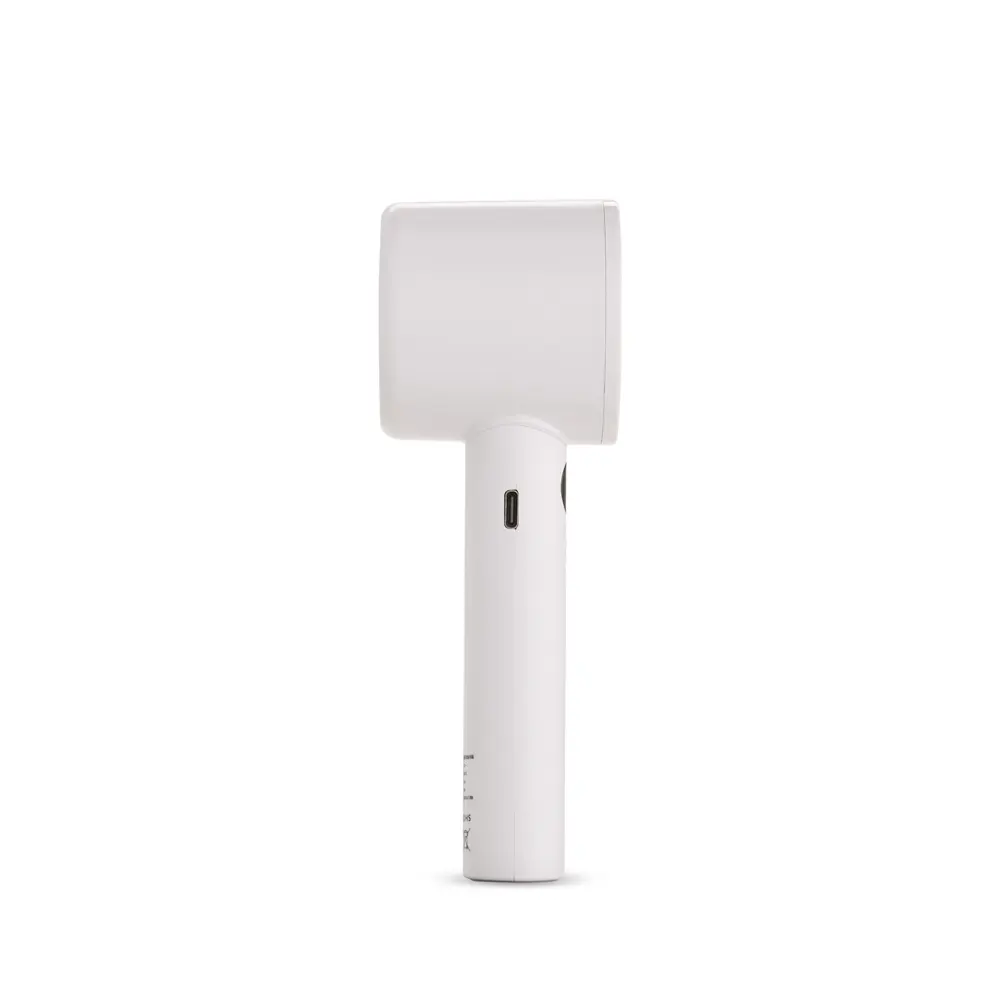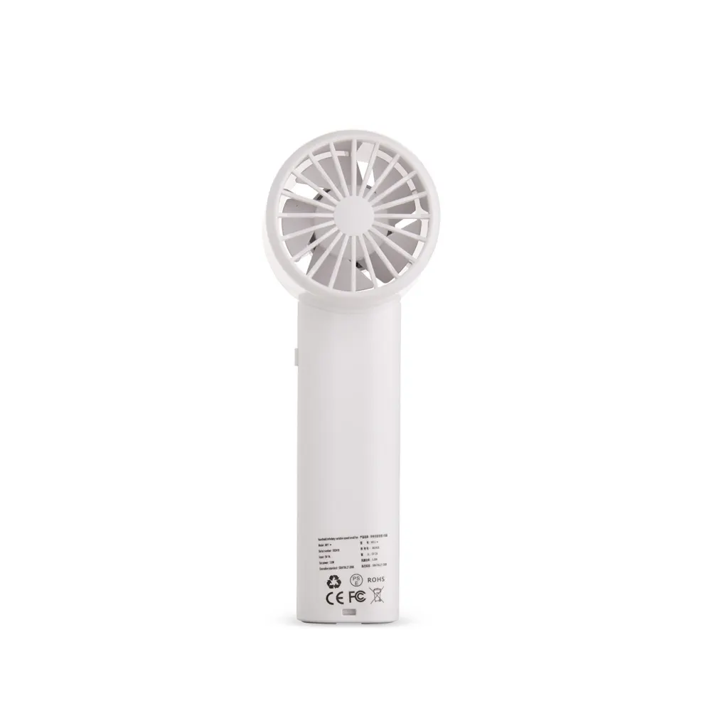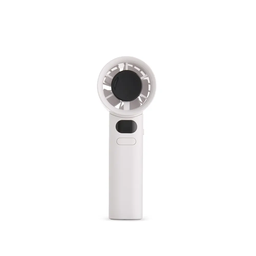 Descrição: Mini ventilador recarregável em plástico e metal. Possui controle de velocidade ajustado por botões frontais, acionamento por chave seletora e painel de LED que exibe níveis de velocidade e carga da bateria. Acompanha cabo USB-C e cordão em nylon.