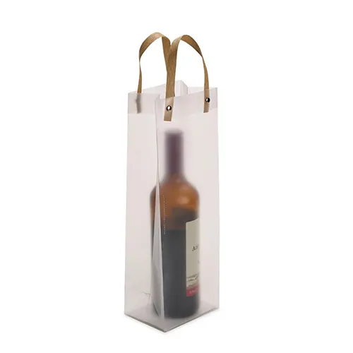 Sacola plástica com formato retangular, acabamento fosco e alças em papelão fixadas por botões metálicos.