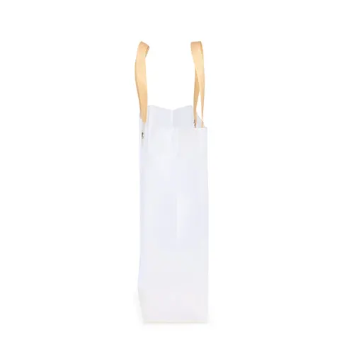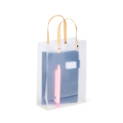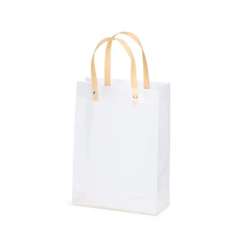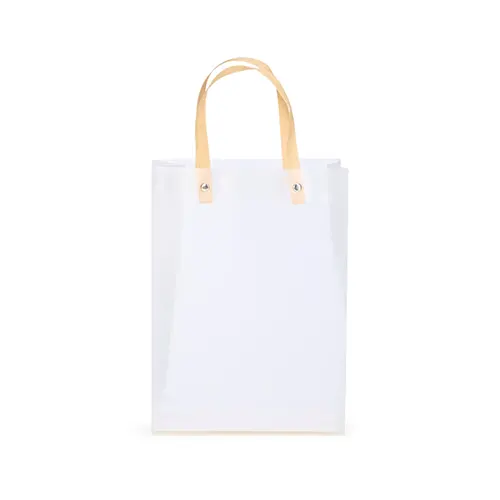 Sacola plástica com formato retangular, acabamento fosco e alças em papelão fixadas por botões metálicos.
